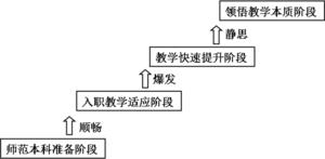 由于Q老师取得的优异成绩,自然也得到学校重点培养,推荐参加了全省重点高中卓越教师的培训。在校内加入了由省级名师命名的教师工作室,校外参加了高师院校的教学和项目研究团队,并开始加强教育理论学习,总结教育教学规律,撰写教学研究论文。Q老师也期待着自己由优秀型教师向智慧学者型教师的蜕变。看得出来,Q老师在教师专业发展过程中,其阶段性是十分清晰的。图1给出了Q老师在教师专业成长过程中几个阶段的关系示意。