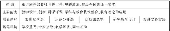 基于多次教学竞赛的经历和视野拓展以及专家的点拨和学习其他优秀教师的长处,Q老师开始反思自己以前的教学方法、思路。她重新审视自己的教案,反思以前教案的缺陷,改进教学方法、教学思路。化学课实验较多,但因为课时有限,也不能带着全班同学把每一个实验都做一遍。通过不断地反思与查阅,她意识到自己可以重新设计教材中的实验,不仅设计耗时短、易操作、效果好的实验,还把原来一个实验分为几个阶段进行的实验同时进行,使同学们同样能获得更多的实验知识,提升实验创新意识,提高课堂效率。对于课程内容的安排,Q老师也不再完全按照课本上的顺序来教学,她在充分了解学生认知的基础上重新安排教学内容,注重归纳、对比、逻辑思路,增强学生对知识的理解。这一阶段Q老师的发展特点是在专家指导、同伴互助下由量变达到教学质的飞跃,即很好地利用各种教育教学资源。其能力培养与培养途径的对应关系如表2所示。