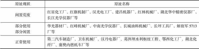 在发展现状上,随着党和国家重大经济战略的调整、军转民政策的出台,大批扎根山区的三线企业逐步向城市转移,遗产原址受到不同程度的影响,大致可划分为以下三种情况:第一,调迁城市建立新厂,原址管理权交由地方政府,由于疏于管理,原址闲置荒废;第二,调迁城市建立新厂,原址仍承担一定生产任务,并保留部分管理人员对原址进行保护修复,原址属于半利用半闲置;第三,仍保留原址且未产生变动,在原址基础上正常生产并持续发展壮大,厂区规模不断扩大(表1)。