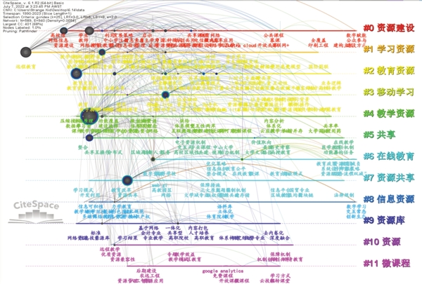 采用Citespace 软件提取文献中的关键词并进行共现,时间(Time Slicing)选取为1990 年1 月-2022 年4 月,结点(Node)类型选取Keyword,网络裁剪类型(Pruning)选取Pathfinder 和Pruning sliced networks,构建出数字化教育资源的关键词共现。对共现关键词进行K 聚类,选取LLR(Likelihood Ratio)聚类方式,开 启Timeline 视图,结果见图2。