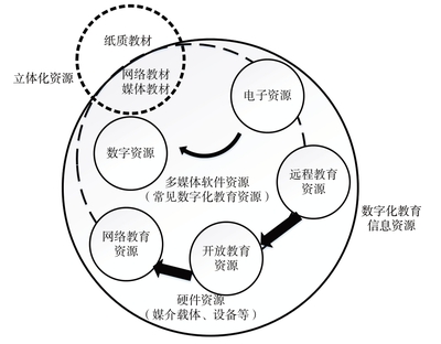 在数字化背景下,教育资源的内涵虽然脱离不开其本身意义,但其形态会有一定变化。熊才平[6]提出记录、承载、传递和应用数字格式教育信息的硬件、软件和潜件均为数字化教育信息资源,其中软硬件为实用的数字设备以及设备配套的软件等,而潜件则被具化成教师和学生对数字资源进行应用的能力[7]。这样的表述类似于李克东提出的数字化学习环境概念,其包括设施、资源、平台、通讯和环境,即每一要素都是信息资源的构成部分;刘贵富等[8]阐述了立体化资源的概念,其包含纸质教材、网络教材与媒体教材。由此可见,数字化教育信息资源为含义最为广泛的概念,其既包含数字化形式的教育资源,也包含其他资源形式中的数字化部分。