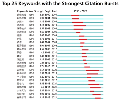 突现词(Burst Word)是指短时间内出现频次发生较大变化的关键词,可以在一定程度上反映研究主题的前沿发展趋势。突现词强度表示该关键词在短时间出现频次骤增的程度。在Burstness 选项卡中,γ 值设定为0.5,最终得到25 个突现词,具体见图3。图中Begin 表示关键词首次出现突现性增长趋势的年份,End 表示结束突现性增长的年份,Strength 表示突现强度,红色段表示突现时长。可以看出,出现较早的突现词为远程教育、网络教育和多媒体,反映出出最先使用数字化资源的领域,即早期的远程教育、网络教育是通过大量使用多媒体资源形成的教育模式;突现跨度较长的关键词为资源库、云计算等,体现了数字资源建设的主要技术手段。资源库是数据经过合理组织后聚集在一起形成的数字资源集合,早期的资源库功能单一,随着网络技术的不断发展,分布式资源库、云资源库等功能强大的资源库陆续出现。近年开始突现的关键词为“互联网+”、在线学习,其中“互联网+”技术使传统行业更好地适应当前社会发展需求,例如“互联网+教育”便是对传统教育的优化、升级和转型;在线学习模式反映了教育资源的泛在化,信息的产生和获取受时空影响的程度变小,数字化资源开始向资源建设、应用和整合的方向发展。此外,关注度较高的研究对象为高职院校。近年来,国家十分重视职业教育,高职院校的教育教学模式、资源开发与应用研究是热度居高不下的话题。